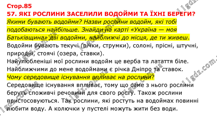 57. ЯКІ РОСЛИНИ ЗАСЕЛИЛИ ВОДОЙМИ ТА ЇХНІ БЕРЕГИ? Якими бувають водойми? Назви рослини водойм, які тобі подобаються найбільше. Знайди на карті «Україна — моя Батьківщина» дві водойми, найближчі до місця, де ти живеш. Водойми бувають текучі (річки, струмки), солоні, прісні, штучні, природні, стоячі (озера, ставки). Найулюбленіші мої рослини водойм це верба та латаття біле. Найближчими до мене водоймами є річка Дніпро та ставок. Чому середовище існування впливає на рослини? Середовище існування впливає, тому що саме з нього рослини беруть споживчі речовини для свого росту. Також рослини пристосовуються. Так рослини, які ростуть на водоймах повинні любити воду. А колючки у пустелі можуть жити без води.
