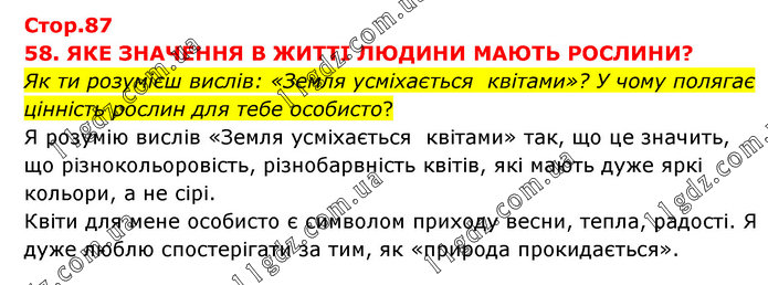 58. ЯКЕ ЗНАЧЕННЯ В ЖИТТІ ЛЮДИНИ МАЮТЬ РОСЛИНИ? Як ти розумієш вислів: «Земля усміхається квітами»? У чому полягає цінність рослин для тебе особисто? Я розумію вислів «Земля усміхається квітами» так, що це значить, що різнокольоровість, різнобарвність квітів, які мають дуже яркі кольори, а не сірі. Квіти для мене особисто є символом приходу весни, тепла, радості. Я дуже люблю спостерігати за тим, як «природа прокидається».