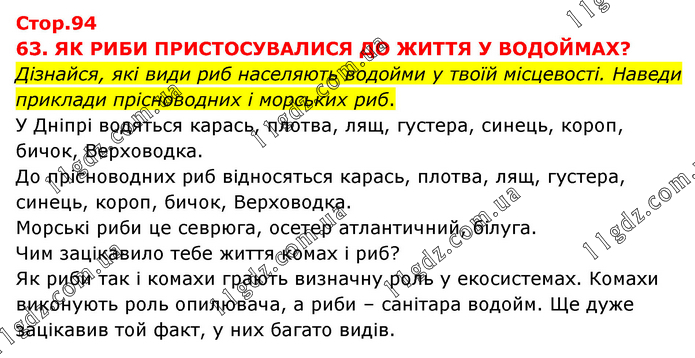 63. ЯК РИБИ ПРИСТОСУВАЛИСЯ ДО ЖИТТЯ У ВОДОЙМАХ? Дізнайся, які види риб населяють водойми у твоїй місцевості. Наведи приклади прісноводних і морських риб. У Дніпрі водяться карась, плотва, лящ, густера, синець, короп, бичок, Верховодка. До прісноводних риб відносяться карась, плотва, лящ, густера, синець, короп, бичок, Верховодка. Морські риби це севрюга, осетер атлантичний, білуга. Чим зацікавило тебе життя комах і риб? Як риби так і комахи грають визначну роль у екосистемах. Комахи виконують роль опилювача, а риби – санітара водойм. Ще дуже зацікавив той факт, у них багато видів.