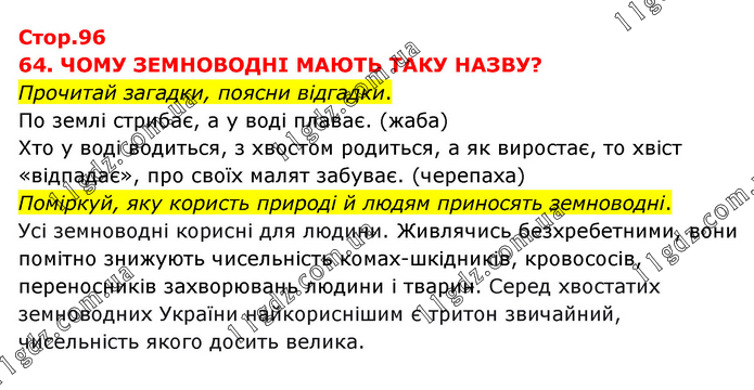 64. ЧОМУ ЗЕМНОВОДНІ МАЮТЬ ТАКУ НАЗВУ? Прочитай загадки, поясни відгадки. По землі стрибає, а у воді плаває. (жаба) Хто у воді водиться, з хвостом родиться, а як виростає, то хвіст «відпадає», про своїх малят забуває. (черепаха) Поміркуй, яку користь природі й людям приносять земноводні. Усі земноводні корисні для людини. Живлячись безхребетними, вони помітно знижують чисельність комах-шкідників, кровососів, переносників захворювань людини і тварин. Серед хвостатих земноводних України найкориснішим є тритон звичайний, чисельність якого досить велика.