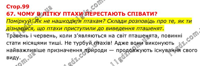 67. ЧОМУ В ЛІТКУ ПТАХИ ПЕРЕСТАЮТЬ СПІВАТИ? Поміркуй. Як не нашкодити птахам? Склади розповідь про те, як ти дізнаєшся, що птахи приступили до виведення пташенят. Травень і червень, коли з’являються на світ пташенята, повинні стати місяцями тиші. Не турбуй птахів! Адже вони виконують найважливіше призначення природи — продовжують існування свого виду.