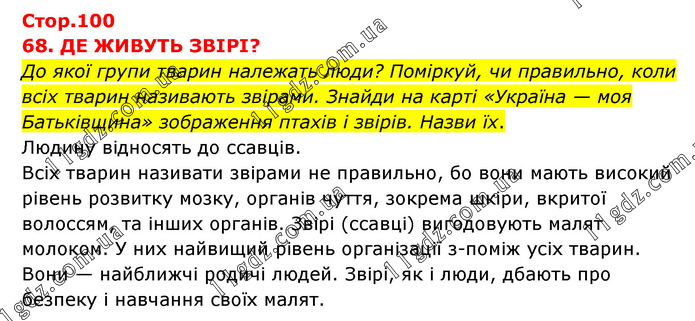 68. ДЕ ЖИВУТЬ ЗВІРІ? До якої групи тварин належать люди? Поміркуй, чи правильно, коли всіх тварин називають звірами. Знайди на карті «Україна — моя Батьківщина» зображення птахів і звірів. Назви їх. Людину відносять до ссавців. Всіх тварин називати звірами не правильно, бо вони мають високий рівень розвитку мозку, органів чуття, зокрема шкіри, вкритої волоссям, та інших органів. Звірі (ссавці) вигодовують малят молоком. У них найвищий рівень організації з-поміж усіх тварин. Вони — найближчі родичі людей. Звірі, як і люди, дбають про безпеку і навчання своїх малят.