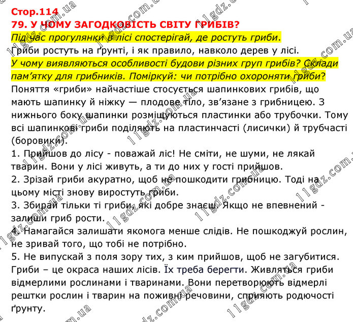 79. У ЧОМУ ЗАГОДКОВІСТЬ СВІТУ ГРИБІВ? Під час прогулянки в лісі спостерігай, де ростуть гриби. Гриби ростуть на ґрунті, і як правило, навколо дерев у лісі. У чому виявляються особливості будови різних груп грибів? Склади пам’ятку для грибників. Поміркуй: чи потрібно охороняти гриби? Поняття «гриби» найчастіше стосується шапинкових грибів, що мають шапинку й ніжку — плодове тіло, зв’язане з грибницею. З нижнього боку шапинки розміщуються пластинки або трубочки. Тому всі шапинкові гриби поділяють на пластинчасті (лисички) й трубчасті (боровики). 1. Прийшов до лісу - поважай ліс! Не сміти, не шуми, не лякай тварин. Вони у лісі живуть, а ти до них у гості прийшов. 2. Зрізай гриби акуратно, щоб не пошкодити грибницю. Тоді на цьому місті знову виростуть гриби. 3. Збирай тільки ті гриби, які добре знаєш. Якщо не впевнений - залиши гриб рости. 4. Намагайся залишати якомога менше слідів. Не пошкоджуй рослин, не зривай того, що тобі не потрібно. 5. Не випускай з поля зору тих, з ким прийшов, щоб не загубитися. Гриби – це окраса наших лісів. Їх треба берегти. Живляться гриби відмерлими рослинами і тваринами. Вони перетворюють відмерлі рештки рослин і тварин на поживні речовини, сприяють родючості ґрунту.