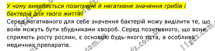 У чому виявляється позитивне й негативне значення грибів і бактерій для твого життя? Серед негативного для себе значення бактерій можу виділити те, що вони можуть бути збудниками хвороб. Серед позитивного, що вони сприяють росту рослин, є основою будь-якого тіста, а особливо медичних препаратів.