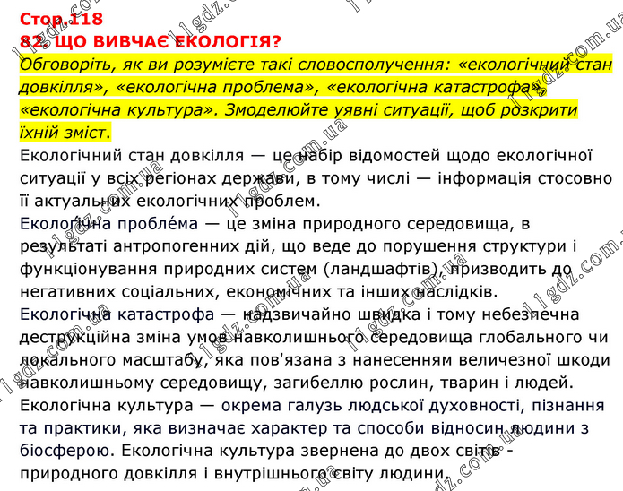 82. ЩО ВИВЧАЄ ЕКОЛОГІЯ? Обговоріть, як ви розумієте такі словосполучення: «екологічний стан довкілля», «екологічна проблема», «екологічна катастрофа», «екологічна культура». Змоделюйте уявні ситуації, щоб розкрити їхній зміст. Екологічний стан довкілля — це набір відомостей щодо екологічної ситуації у всіх регіонах держави, в тому числі — інформація стосовно її актуальних екологічних проблем. Екологі́чна пробле́ма — це зміна природного середовища, в результаті антропогенних дій, що веде до порушення структури і функціонування природних систем (ландшафтів), призводить до негативних соціальних, економічних та інших наслідків. Екологічна катастрофа — надзвичайно швидка і тому небезпечна деструкційна зміна умов навколишнього середовища глобального чи локального масштабу, яка пов'язана з нанесенням величезної шкоди навколишньому середовищу, загибеллю рослин, тварин і людей. Екологічна культура — окрема галузь людської духовності, пізнання та практики, яка визначає характер та способи відносин людини з біосферою. Екологічна культура звернена до двох світів - природного довкілля і внутрішнього світу людини.