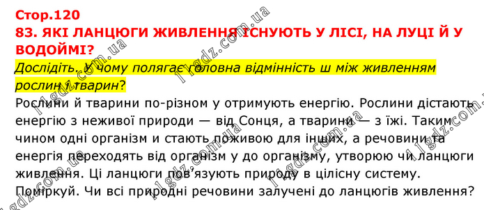83. ЯКІ ЛАНЦЮГИ ЖИВЛЕННЯ ІСНУЮТЬ У ЛІСІ, НА ЛУЦІ Й У ВОДОЙМІ? Дослідіть. У чому полягає головна відмінність ш між живленням рослин і тварин? Рослини й тварини по-різном у отримують енергію. Рослини дістають енергію з неживої природи — від Сонця, а тварини — з їжі. Таким чином одні організм и стають поживою для інших, а речовини та енергія переходять від організм у до організму, утворюю чи ланцюги живлення. Ці ланцюги пов’язують природу в цілісну систему. Поміркуй. Чи всі природні речовини залучені до ланцюгів живлення?