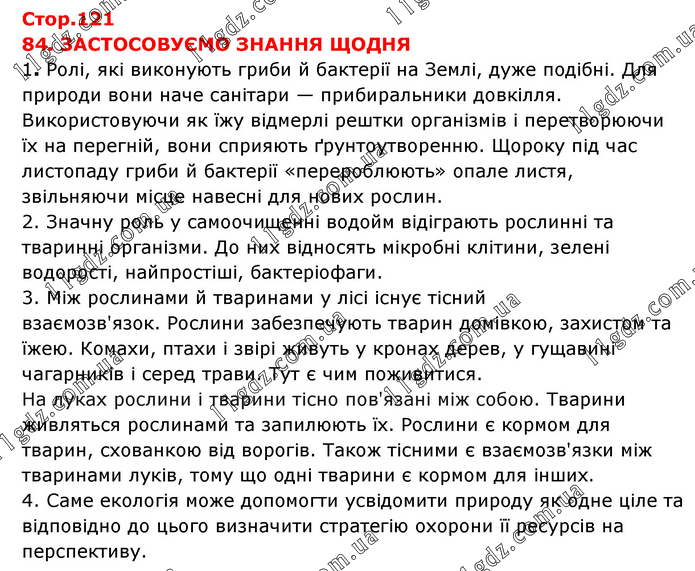 84. ЗАСТОСОВУЄМО ЗНАННЯ ЩОДНЯ 1. Ролі, які виконують гриби й бактерії на Землі, дуже подібні. Для природи вони наче санітари — прибиральники довкілля. Використовуючи як їжу відмерлі рештки організмів і перетворюючи їх на перегній, вони сприяють ґрунтоутворенню. Щороку під час листопаду гриби й бактерії «перероблюють» опале листя, звільняючи місце навесні для нових рослин. 2. Значну роль у самоочищенні водойм відіграють рослинні та тваринні організми. До них відносять мікробні клітини, зелені водорості, найпростіші, бактеріофаги. 3. Між рослинами й тваринами у лісі існує тісний взаємозв'язок. Рослини забезпечують тварин домівкою, захистом та їжею. Комахи, птахи і звірі живуть у кронах дерев, у гущавині чагарників і серед трави. Тут є чим поживитися. На луках рослини і тварини тісно пов'язані між собою. Тварини живляться рослинами та запилюють їх. Рослини є кормом для тварин, схованкою від ворогів. Також тісними є взаємозв'язки між тваринами луків, тому що одні тварини є кормом для інших. 4. Саме екологія може допомогти усвідомити природу як одне ціле та відповідно до цього визначити стратегію охорони її ресурсів на перспективу.