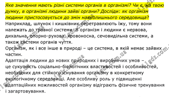 Яке значення мають різні системи органів в організмі? Чи є, на твою думку, в організмі людини зайві органи? Досліди: як організм людини пристосовується до змін навколишнього середовища? Наприклад, шлунок і кишківник перетравлюють їжу, тому вони належать до травної системи. В організм і людини є нервова, дихальна, опорно-рухова, кровоносна, сечовидільна системи, а також системи органів чуття. Організм, як і все інше в природі – це система, в якій немає зайвих частин. Адаптація людини до нових природних і виробничих умов –це сукупність соціально-біологічних властивостей і особливостей, необхідних для стійкого існування організму в конкретному екологічному середовищі. Але особливу роль у підвищенні адаптаційних можливостей організму відіграють фізичне тренування і загартовування.