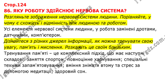 86. ЯКУ РОБОТУ ЗДІЙСНЮЄ НЕРВОВА СИСТЕМА? Розгляньте зображення нервової системи людини. Порівняйте, у чому є схожість і відмінність між людиною та роботом. Усі елементи нервової системи людини, у робота замінені дротами, датчиками, комп’ютером. Дізнайтеся з різних джерел інформації, як можна тренувати свою увагу, пам’ять і мислення. Розкажіть це своїм близьким. Тренування пам'яті – це комплексний підхід, що має наступні складові: заняття спортом; повноцінне харчування; спеціальні техніки запам'ятовування; вміння знімати втому та стрес за допомогою медитації; здоровий сон.