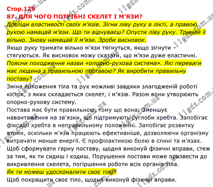 87. ДЛЯ ЧОГО ПОТРІБНІ СКЕЛЕТ І М’ЯЗИ? Досліди властивості своїх м’язів. Зігни ліву руку в лікті, а правою рукою намацай м’язи. Що ти відчуваєш? Опусти ліву руку. Тримай її вільно. Знову намацай її м’язи. Зроби висновок. Якщо руку тримати вільно м’язи тягнуться, якщо зігнути – стягуються. Як висновок можу сказати, що м’язи дуже еластичні. Поясни походження назви «опорно-рухова система». Які переваги має людина з правильною поставою? Як виробити правильну поставу? Зміна положення тіла та рух можливі завдяки злагодженій роботі кісток, з яких складається скелет, і м’язів. Разом вони утворюють опорно-рухову систему. Постава має бути правильною, тому що вона: Зменшує навантаження на зв'язки, що підтримують суглоби хребта. Запобігає фіксації хребта в неправильному положенні. Запобігає розвитку втоми, оскільки м'язи працюють ефективніше, дозволяючи організму витрачати менше енергії. Є профілактикою болю в спині та м'язах. Щоб сформувати гарну поставу, щодня виконуй фізичні вправи, стеж за тим, як ти сидиш і ходиш. Порушення постави може призвести до викривлення скелета, погіршення роботи всіх органів тіла. Як ти можеш удосконалити своє тіло? Щоб покращити своє тіло, щодня виконуй фізичні вправи.