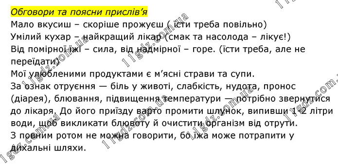 Обговори та поясни прислів’я Мало вкусиш – скоріше прожуєш ( їсти треба повільно) Умілий кухар – найкращий лікар (смак та насолода – лікує!) Від помірної їжі – сила, від надмірної – горе. (їсти треба, але не переїдати) Мої улюбленими продуктами є м’ясні страви та супи. За ознак отруєння — біль у животі, слабкість, нудота, пронос (діарея), блювання, підвищення температури — потрібно звернутися до лікаря. До його приїзду варто промити шлунок, випивши 1-2 літри води, щоб викликати блювоту й очистити організм від отрути. З повним ротом не можна говорити, бо їжа може потрапити у дихальні шляхи.