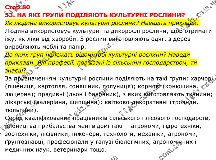 53. НА ЯКІ ГРУПИ ПОДІЛЯЮТЬ КУЛЬТУРНІ РОСЛИНИ? Як людина використовує культурні рослини? Наведіть приклади. Людина використовує культурні та дикорослі рослини, щоб отримати їжу, як ліки від хвороби. З рослин виготовляють одяг, з дерев виробляють меблі та папір. До яких груп належать відомі тобі культурні рослини? Наведи приклади. Які професії, пов’язані із сільським господарством, ти знаєш? За призначенням культурні рослини поділяють на такі групи: харчові (пшениця, картопля, соняшник, полуниця); кормові (конюшина, люцерна); прядивні (льон і бавовник), з яких виготовляють тканини; лікарські (валеріана, шипшина); квітково-декоративні (троянди, тюльпани). Серед кваліфікованих працівників сільського і лісового господарств, рибництва і рибальства мені відомі такі - агрономи, гідротехніки, зоотехніки, лісівники, інженери, технологи, механіки, агрономи, ґрунтознавці, професіонали у галузі біологічних, агрономічних і медичних наук, ветеринари тощо.