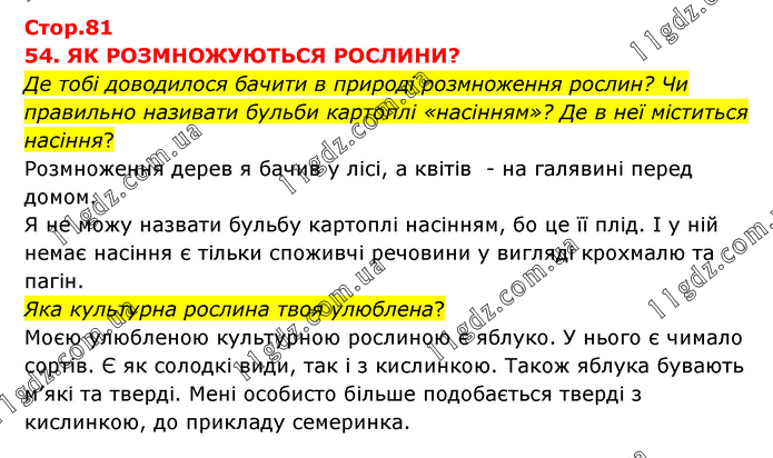 54. ЯК РОЗМНОЖУЮТЬСЯ РОСЛИНИ? Де тобі доводилося бачити в природі розмноження рослин? Чи правильно називати бульби картоплі «насінням»? Де в неї міститься насіння? Розмноження дерев я бачив у лісі, а квітів - на галявині перед домом. Я не можу назвати бульбу картоплі насінням, бо це її плід. І у ній немає насіння є тільки споживчі речовини у вигляді крохмалю та пагін. Яка культурна рослина твоя улюблена? Моєю улюбленою культурною рослиною є яблуко. У нього є чимало сортів. Є як солодкі види, так і з кислинкою. Також яблука бувають м’які та тверді. Мені особисто більше подобається тверді з кислинкою, до прикладу семеринка.