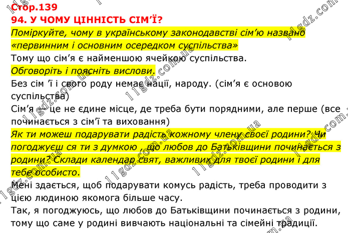94. У ЧОМУ ЦІННІСТЬ СІМ’Ї? Поміркуйте, чому в українському законодавстві сім’ю названо «первинним і основним осередком суспільства» Тому що сім’я є найменшою ячейкою суспільства. Обговоріть і поясніть вислови. Без сім ’ї і свого роду немає нації, народу. (сім’я є основою суспільства) Сім’я — це не єдине місце, де треба бути порядними, але перше (все починається з сім’ї та виховання) Як ти можеш подарувати радість кожному члену своєї родини? Чи погоджуєш ся ти з думкою , що любов до Батьківщини починається з родини? Склади календар свят, важливих для твоєї родини і для тебе особисто. Мені здається, щоб подарувати комусь радість, треба проводити з цією людиною якомога більше часу. Так, я погоджуюсь, що любов до Батьківщини починається з родини, тому що саме у родині вивчають національні та сімейні традиції.
