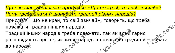 Що означає українське прислів’я: «Що не край, то свій звичай»? Чому треба знати й шанувати традиції різних народів? Прислів’я «Що не край, то свій звичай», говорить, що треба поважати традиції інших народів. Традиції інших народів треба поважати, так як вони гарно розповідають про те, як живе народ, а повага до традицій – повага до народу.
