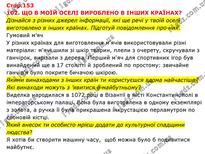 102. ЩО В МОЇЙ ОСЕЛІ ВИРОБЛЕНО В ІНШИХ КРАЇНАХ? Дізнайся з різних джерел інформації, які ще речі у твоїй оселі виготовлено в інших країнах. Підготуй повідомлення про них. Гумовий м’яч У різних країнах для виготовлення м'ячів використовували різні матеріали: м'ячі шили зі шкір тварин, плели з очерету, скручували з ганчірок, вирізали з дерева. Перший м'яч для спортивних ігор був винайдений ще в 17 столітті й зроблений по простому: звичайне ганчір'я було покрите бичачою шкірою. Якими винаходами з інших країн ти користуєшся вдома найчастіше? Які винаходи можуть з ’явитися в майбутньому? Виделка народилася в 1072 році в Візантії в місті Константинополі в імператорському палаці. Вона була виготовлена в одному екземплярі з золота, а ручка її була прикрашена інкрустацією перламутром по слоновій кістці. Який внесок ти особисто мрієш додати до культурної спадщини людства? Я хотів би створити машину часу, щоб можна було б подивитися майбутнє.