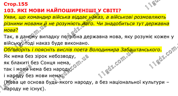 103. ЯКІ МОВИ НАЙПОШИРЕНІШІ У СВІТІ? Уяви, що командир війська віддає наказ, а військові розмовляють різними мовами й не розуміють його. Чи знадобиться тут державна мова? Так, в даному випадку потрібна державна мова, яку розуміє кожен у війську, тоді наказ буде виконано. Обговоріть і поясніть вислів поета Володимира Забаштанського. Як нема без зірок небозводу, як блакиті без Сонця нема, так і мови нема без народу, і народу без мови нема. (Мова це основа будь-якого народу, а без національної культури – народу не існує).