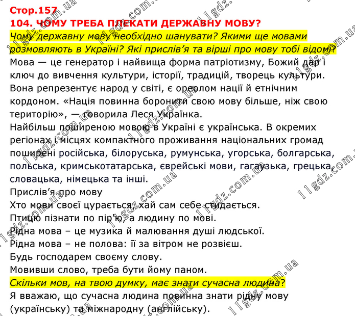 104. ЧОМУ ТРЕБА ПЛЕКАТИ ДЕРЖАВНУ МОВУ? Чому державну мову необхідно шанувати? Якими ще мовами розмовляють в Україні? Які прислів’я та вірші про мову тобі відомі? Мова — це генератор і найвища форма патріотизму, Божий дар і ключ до вивчення культури, історії, традицій, творець культури. Вона репрезентує народ у світі, є ореолом нації й етнічним кордоном. «Нація повинна боронити свою мову більше, ніж свою територію», — говорила Леся Українка. Найбільш поширеною мовою в Україні є українська. В окремих регіонах і місцях компактного проживання національних громад поширені російська, білоруська, румунська, угорська, болгарська, польська, кримськотатарська, єврейські мови, гагаузька, грецька, словацька, німецька та інші. Прислів’я про мову Хто мови своєї цурається, хай сам себе стидається. Птицю пізнати по пір'ю, а людину по мові. Рідна мова – це музика й малювання душі людської. Рідна мова – не полова: її за вітром не розвієш. Будь господарем своєму слову. Мовивши слово, треба бути йому паном. Скільки мов, на твою думку, має знати сучасна людина? Я вважаю, що сучасна людина повинна знати рідну мову (українську) та міжнародну (англійську).