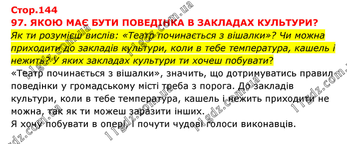 97. ЯКОЮ МАЄ БУТИ ПОВЕДІНКА В ЗАКЛАДАХ КУЛЬТУРИ? Як ти розумієш вислів: «Театр починається з вішалки»? Чи можна приходити до закладів культури, коли в тебе температура, кашель і нежить? У яких закладах культури ти хочеш побувати? «Театр починається з вішалки», значить, що дотримуватись правил поведінки у громадському місті треба з порога. До закладів культури, коли в тебе температура, кашель і нежить приходити не можна, так як ти можеш заразити інших. Я хочу побувати в опері, і почути чудові голоси виконавців.