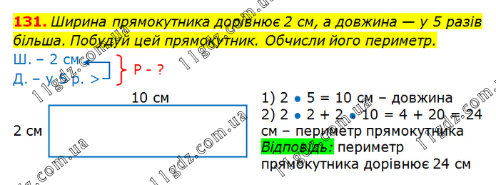 Ширина прямокутника дорівнює 2 см, а довжина — у 5 разів більша. Побудуй цей прямокутник. Обчисли його периметр.