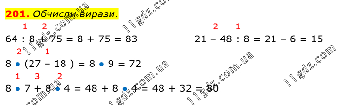 Обчисли вирази. 64 : 8 + 75 21 – 48 : 8 72 : (35 – 27) 56 : 8 + 8 • 6