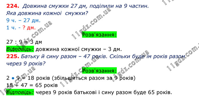 Діти розрізали паперову смужку завдовжки 27 дм на 9 рівних частин. Яка довжина кожної частини? Батькові й сину разом 47 років. Скільки років буде їм разом через 9 років?