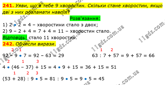 Уяви, що в тебе 9 хворостин. Скільки стане хворостин, якщо дві з них розламати навпіл? Розв'язання: 1) 2 ● 2 = 4 – хворостини стало з двох; 2) 9 – 2 + 4 = 7 + 4 = 11 – хворостин стало. Відповідь: стало 11 хворостин. 242. Обчисли вирази. 92 – 9 ● 7 = 92 – 63 = 29 63 : 7 + 57 = 9 + 57 = 66 4 ● (46 – 37) + 15 = 4 ● 9 + 15 = 36 + 15 = 51 (53 + 28) : 9 ● 5 = 81 : 9 ● 5 = 9 ● 5 = 45