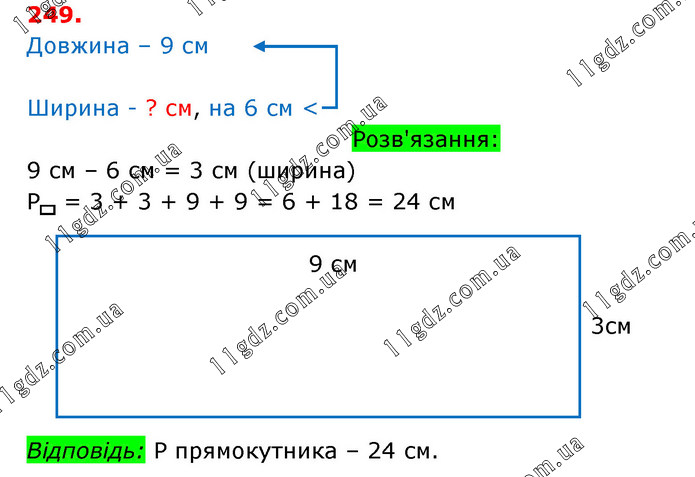 Довжина сторони прямокутника дорівнює 9 см, а ширина — на 6 см менша, ніж довжина. Накресли цей прямокутник. Обчисли його периметр.