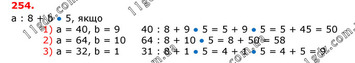 Обчисли значення виразу а : 8 + b • 5, якщо а = 40, 64, 32; b = 9, 10, 1.