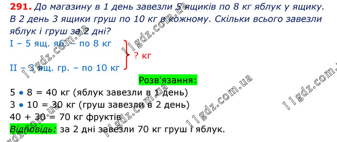 Склади й розв’яжи задачу за коротким записом умови. 5 ящ. — ?, по 8 кг яблук ? 3 ящ. — ?, по 10 кг груш