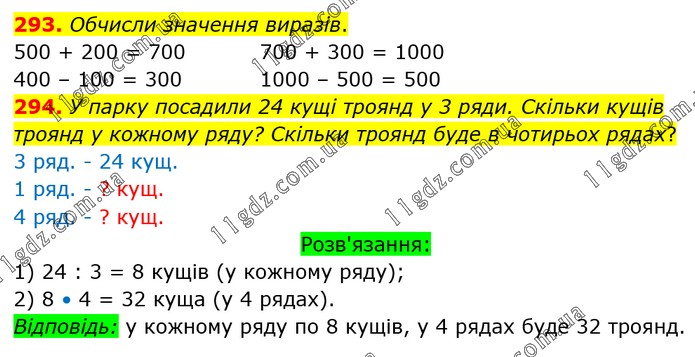 293. Обчисли значення виразів. 500 + 200 = 700 700 + 300 = 1000 400 – 100 = 300 1000 – 500 = 500 294. У парку посадили 24 кущі троянд у 3 ряди. Скільки кущів троянд у кожному ряду? Скільки троянд буде в чотирьох рядах? 3 ряд. - 24 кущ. 1 ряд. - ? кущ. 4 ряд. - ? кущ. Розв'язання: 1) 24 : 3 = 8 кущів (у кожному ряду); 2) 8 • 4 = 32 куща (у 4 рядах). Відповідь: у кожному ряду по 8 кущів, у 4 рядах буде 32 троянд.