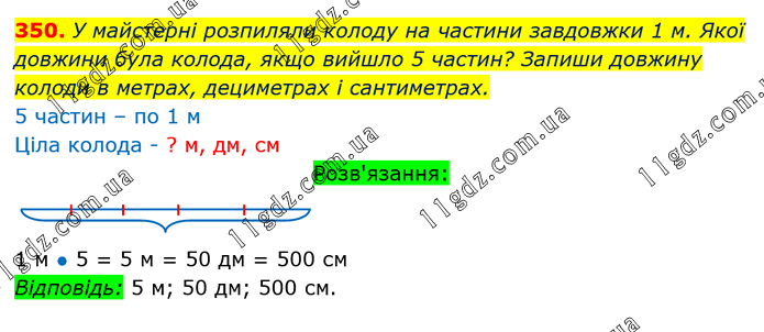 У майстерні розпиляли колоду на частини завдовжки 1 м. Якої довжини була колода, якщо вийшло 5 частин? Запиши довжину колоди в метрах, дециметрах і сантиметрах. 5 частин – по 1 м Ціла колода - ? м, дм, см Розв'язання: 1 м ● 5 = 5 м = 50 дм = 500 см Відповідь: 5 м; 50 дм; 500 см.