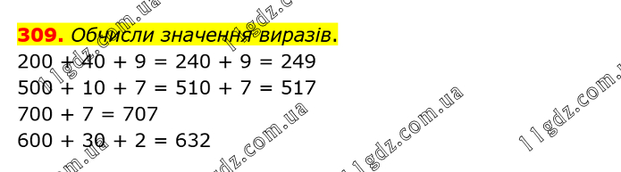 Обчисли значення виразів. 200 + 40 + 9 = 240 + 9 = 249 500 + 10 + 7 = 510 + 7 = 517 700 + 7 = 707 600 + 30 + 2 = 632