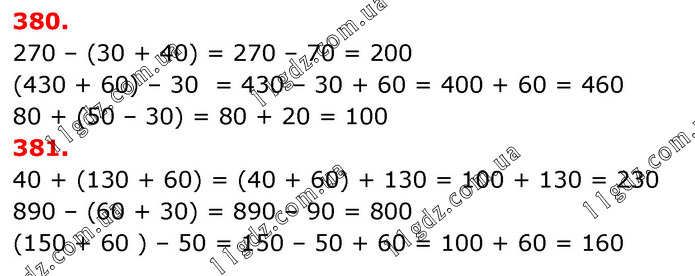 Розстав дужки так, щоб рівності стали істинними. 270 – 30 + 40 = 200 430 + 60 – 30 = 460 Обчисли вирази зручним способом. 40 + (130 + 60) 890 – (60 + 30) 80 + 50 – 30 = 10