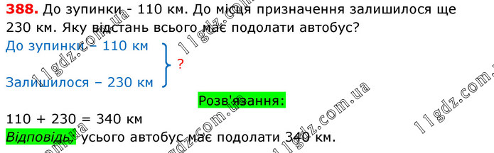Міжміський автобус проїхав до зупинки 110 км. До місця призначення йому залишилося проїхати ще 230 км. Яку відстань усього має подолати автобус?