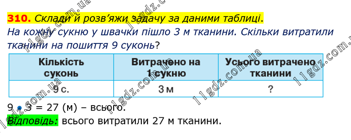 Склади й розв’яжи задачу за даними таблиці. На кожну сукню у швачки пішло 3 м тканини. Скільки витратили тканини на пошиття 9 суконь? 9 ● 3 = 27 (м) – всього. Відповідь: всього витратили 27 м тканини.