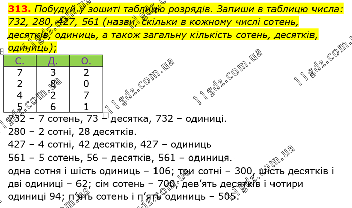 Побудуй у зошиті таблицю розрядів. Запиши в таблицю числа: 732, 280, 427, 561 (назви, скільки в кожному числі сотень, десятків, одиниць, а також загальну кількість сотень, десятків, одиниць); С. Д. О. 7 2 4 5 3 8 2 6 2 0 7 1 732 – 7 сотень, 73 – десятка, 732 – одиниці. 280 – 2 сотні, 28 десятків. 427 – 4 сотні, 42 десятків, 427 – одиниць 561 – 5 сотень, 56 – десятків, 561 – одиниця. одна сотня і шість одиниць – 106; три сотні – 300, шість десятків і дві одиниці – 62; сім сотень – 700, дев’ять десятків і чотири одиниці 94; п’ять сотень і п’ять одиниць – 505.