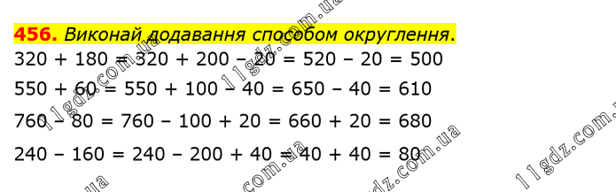 Виконай додавання способом округлення. 320 + 180 = 320 + 200 – 20 = 520 – 20 = 500 550 + 60 = 550 + 100 – 40 = 650 – 40 = 610 760 – 80 = 760 – 100 + 20 = 660 + 20 = 680 240 – 160 = 240 – 200 + 40 = 40 + 40 = 80