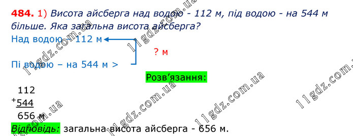 Розв’яжи задачі, виконуючи обчислення письмово. 1) Висота айсберга над водою становить 112 м, а під водою — на 544 м більше. Яка загальна висота айсберга?