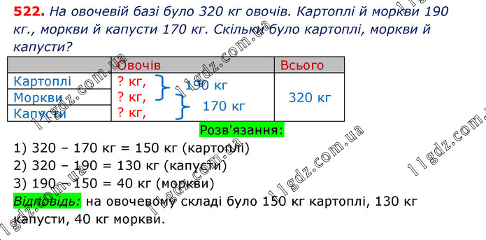 На овочевому складі було 320 кг овочів: картоплі й моркви — 190 кг, моркви й капусти — 170 кг. Скільки було на овочевому складі окремо картоплі, моркви й капусти?