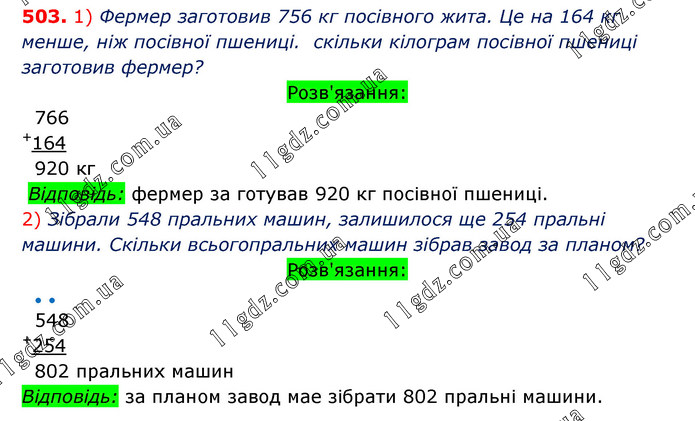 Розв’яжи задачі, виконуючи обчислення письмово. 1) Фермер заготовив 756 кг посівного жита. Це на 164 кг менше, ніж він заготовив посівної пшениці. Скільки кілограмів посівної пшениці заготовив фермер? 2) Після того як на заводі зібрали 548 пральних машин, залишилося зібрати ще 254 пральні машини. Скільки всього пральних машин повинен зібрати завод згідно з планом?