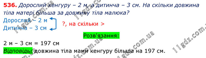 Дорослий кенгуру має зріст 2 м, а дитинча в кенгуру народжується завдовжки всього 3 см. На скільки сантиметрів довжина тіла матері кен-гуру більша за довжину тіла малюка?