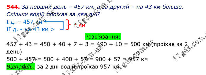 Водій був у відрядженні два дні. За перший день він подолав відстань 457 км, а за другий день — на 43 км більше. Скільки кілометрів проїхав водій за два дні?