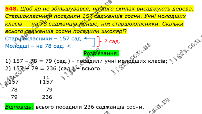 Щоб яр не збільшувався, на його схилах висаджують дерева. Старшокласники посадили 157 саджанців сосни. Учні молодших класів — на 78 саджанців менше, ніж старшокласники. Скільки всього саджанців сосни посадили школярі? Старшокласники – 157 сад. Молодші – на 78 сад. < Розв'язання: 1) 157 – 78 = 79 (сад.) - посадили учні молодших класів; 2) 157 + 79 = 236 (сад.) – всього.
