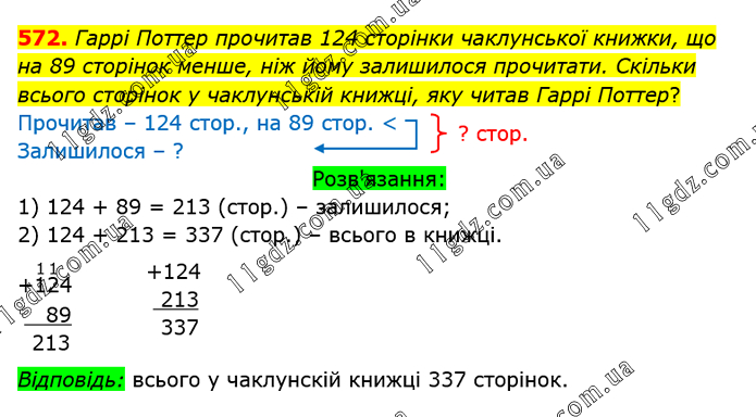 Гаррі Поттер прочитав 124 сторінки чаклунської книжки, що на 89 сторінок менше, ніж йому залишилося прочитати. Скільки всього сторінок у чаклунській книжці, яку читав Гаррі Поттер? Прочитав – 124 стор., на 89 стор. < Залишилося – ? Розв'язання: 1) 124 + 89 = 213 (стор.) – залишилося; 2) 124 + 213 = 337 (стор.) – всього в книжці.