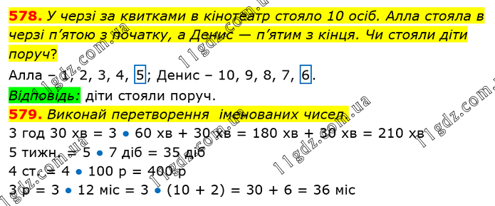 У черзі за квитками в кінотеатр стояло 10 осіб. Алла стояла в черзі п’ятою з початку, а Денис — п’ятим з кінця. Чи стояли діти поруч? Алла – 1, 2, 3, 4, 5; Денис – 10, 9, 8, 7, 6. Відповідь: діти стояли поруч. 579. Виконай перетворення іменованих чисел. 3 год 30 хв = 3 ● 60 хв + 30 хв = 180 хв + 30 хв = 210 хв 5 тижн. = 5 ● 7 діб = 35 діб 4 ст. = 4 ● 100 р = 400 р 3 р = 3 ● 12 міс = 3 ● (10 + 2) = 30 + 6 = 36 міс