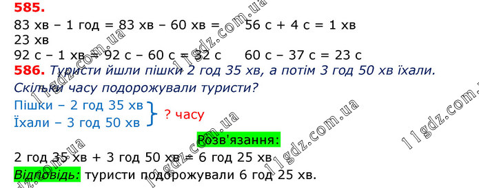 Туристи йшли пішки 2 год 35 хв, а потім їхали автобусом 3 год 50 хв. Скільки часу подорожували туристи?