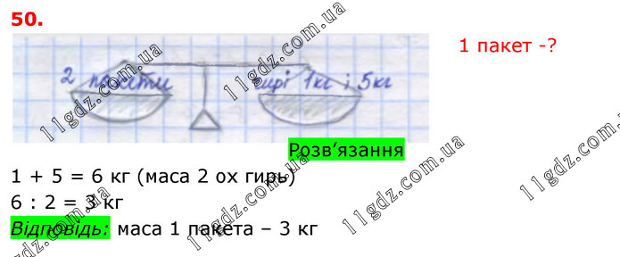 На одній шальці терезів лежать 2 однакові пакети, а на дру-гій стоять гирі 1 кг і 5 кг. Терези перебувають у рівновазі. Яка маса одного пакета?