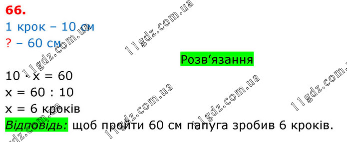 Довжина кроку папуги становить 10 см. Скільки таких кроків зробив папуга, пройшовши відстань у 60 см? Розв’яжи задачу, склавши рівняння