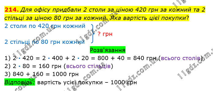 Для офісу придбали 2 столи за ціною 420 грн за кожний та 2 стільці за ціною 80 грн за кожний. Яка вартість цієї покупки? 2 столи по 420 грн кожний ? грн 2 стільці по 80 грн кожний Розв'язання 1) 2 ∙ 420 = 2 ∙ 400 + 2 ∙ 20 = 800 + 40 = 840 грн (всього столів) 2) 2 ∙ 80 = 160 грн (всього стільців) 3) 840 + 160 = 1000 грн Відповідь: вартість усієї покупки – 1000 грн